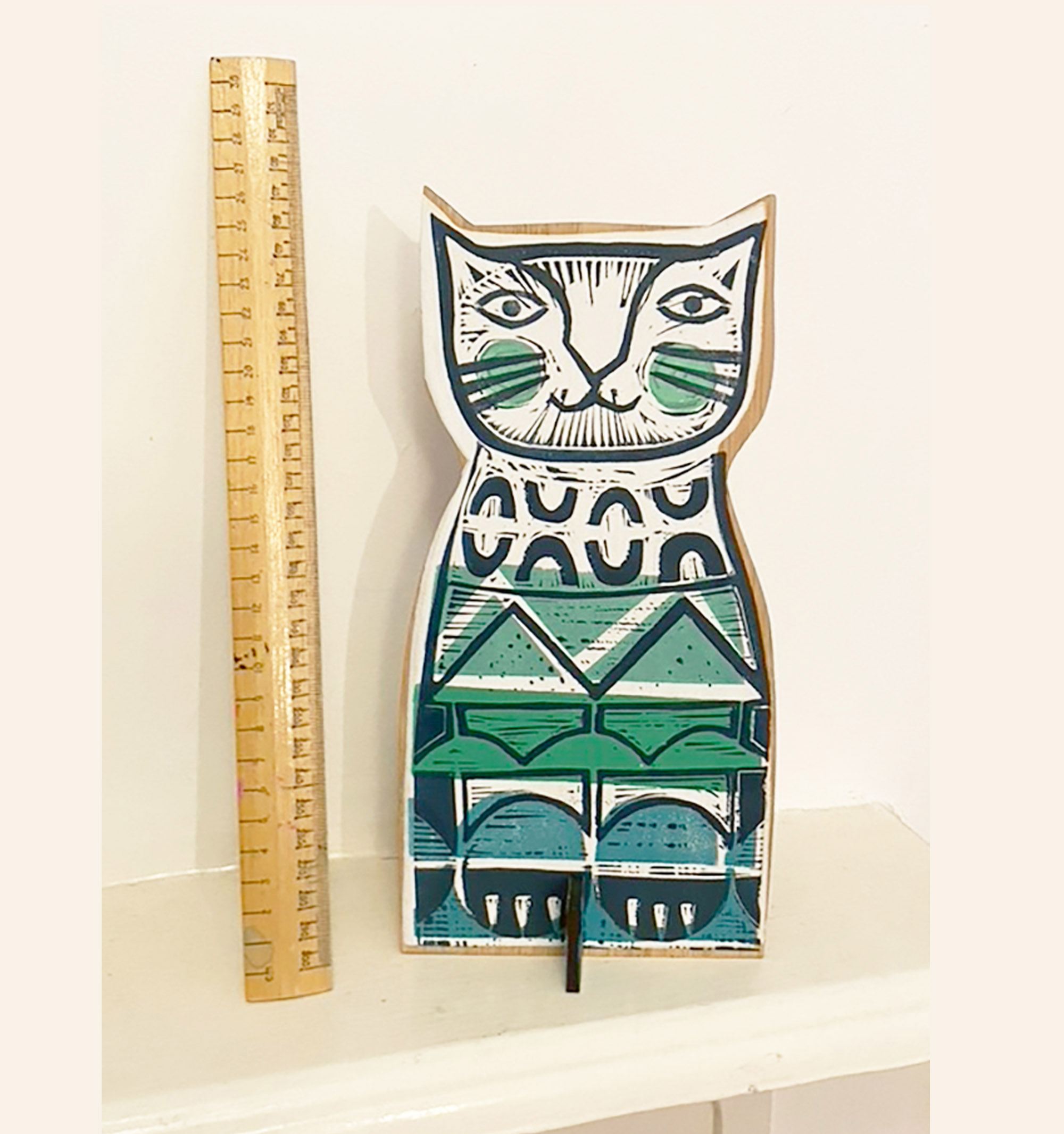 Clever Cat is lino cut and stamp printed onto 5mm thick laser cut bamboo with an archival varnish to protect it.