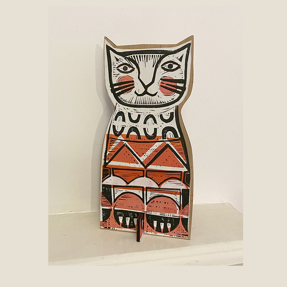 Each cat is lino cut and stamp printed onto 5mm thick laser cut bamboo with an archival varnish to protect it.