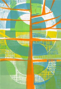 The second series of three workshops involved Gelli printing. This time participants printed onto Gelli plates using hand-cut stencils provided by me, or made on the workshops, again on the ‘Earth, Sea, Sky’ theme. Many were intrigued by the name ‘Gelli’ printing and had not heard of the technique before. Compared to stamp printing there was less control of the outcome and more chance of surprises, both good and disappointing. I encouraged participants to create layers of printing and to persevere when a result was not as expected. Explaining that often it is the fourth or even fifth layer of colour that really brings the print to life.